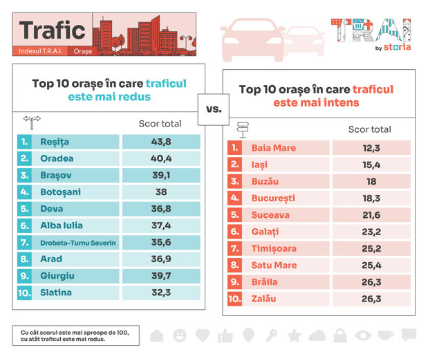 În prezent, Reșița, Oradea, Brașov, Botoșani și Deva sunt orașele din România cu traficul rutier cel mai redus, în timp ce la polul opus se află Baia Mare, Iași, Buzău, București și Suceava, unde traficul este cel mai intens comparativ cu cel din orașele analizate în cadrul indexului T.R.A.I., realizat de Storia. La capitolul cartierelor cu cel mai redus trafic rutier se regăsește cartierul Recita din Reșița, cu un scor de 100 de puncte, singurul din platformă cu punctaj maxim. În ceea ce privește Capitala, cartierul cu cel mai redus trafic din București, conform datelor platformei din acest moment, este Pădurea Băneasa, cu un scor de 72,8 puncte.