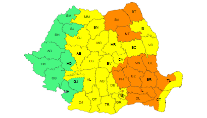 În nordul și estul Munteniei, sudul Moldovei, sud-estul Transilvaniei și în Dobrogea continentală vor fi averse torențiale, frecvente descărcări electrice, vijelii puternice (viteze ale vântului de 70-90 km/h) și grindină de medii și mari dimensiuni (2-5 cm). În intervale scurte de timp (1-3 ore), cantitățile de apă vor fi de 30-40 l/mp și pe arii restrânse de peste 60 l/mp., au precizat meteorologii.