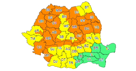 Codul galben este valabil în perioada 6 iulie, ora 12.00 – 7 iulie, ora 10.00, meteorologii precizând: „În Banat, Crișana, Maramureș, Transilvania, Oltenia, Moldova, precum și în vestul și nordul Munteniei vor fi perioade cu instabilitate atmosferică accentuată. Aceasta se va manifesta prin averse, descărcări electrice, intensificări de scurtă durată ale vântului (viteze în general de 55-65 km/h), vijelii și grindină. În intervale scurte de timp, cantitățile de apă vor fi de 20-25 l/mp și izolat peste 40 l/mp”.