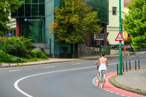 Amenajarea acestei piste pentru biciclete se va face pe partea carosabilă, delimitată de traficul rutier prin marcaj longitudinal și profile prefabricate din cauciuc, peste care pot trece, la nevoie, mașinile de intervenție. În zonele unde dimensiunea străzilor nu permite crearea culoarului exclusiv pentru biciclete, traficul se va desfășura în comun cu autovehiculele, pe partea carosabilă, unde se vor amenaja marcaje transversale vizibile, la distanță de maxim 25 metri, dublate de indicatoare rutiere.