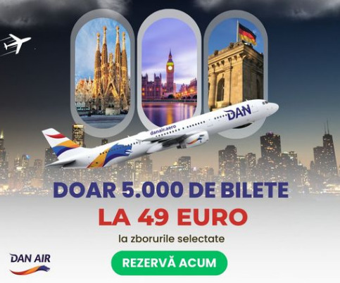 Dan Air – încă o ofertă. Astăzi, reprezentanții firmei amintite au lansat o nouă ofertă: „Bilete la super preț pentru destinațiile tale favorite! Doar în această săptămână poți beneficia de reducere. Am pregătit 5.000 de bilete la doar 49 de euro/persoană. Grăbește-te și rezervă-ți acum următoarea destinație. Atenție! Oferta se aplică doar la zborurile selectate”.