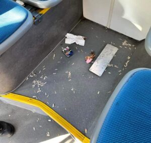 Un membru al grupului de Facebook RATBV – Grupul Călătorilor a postat imagini cu mizeria lăsată în urmă de oameni într-un autobuz care circulă pe o linie din municipiul Brașov.
