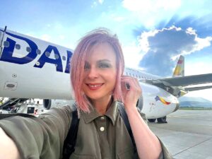 Flavia Boghiu, selfie oficial din Aeroportul Brașov. Delegația a plecat la Nuremberg tot cu avionul de pe Aeroportul Brașov.