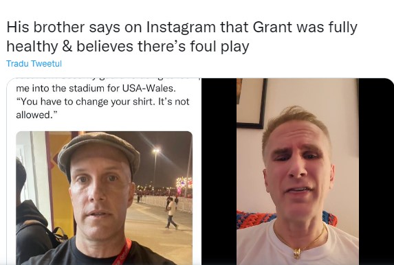 „Numele meu este Eric Wahl și locuiesc în Seattle, Washington. Sunt fratele lui Grant Wahl. Eu sunt motivul pentru care el a purtat acel tricou la Cupa Mondială. Fratele meu era sănătos. Mi-a spus că a primit amenințări cu moartea. Nu cred că fratele meu a murit pur și simplu. Cred că a fost omorât. Vă implor să mă ajutați!”, a spus acesta.