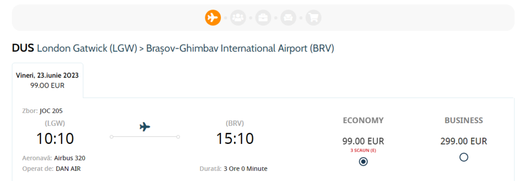 De la Aeroportul Brașov spre Londra, Dan Air va decola în 16 iunie la ora 20.20 (ora România), urmând să aterizeze pe Gatwick la 21.30 (ora Marii Britanii). Potrivit site-ului de rezervări al companiei românești, un bilet pentru zborul amintit la clasa economic este de 79 de euro.