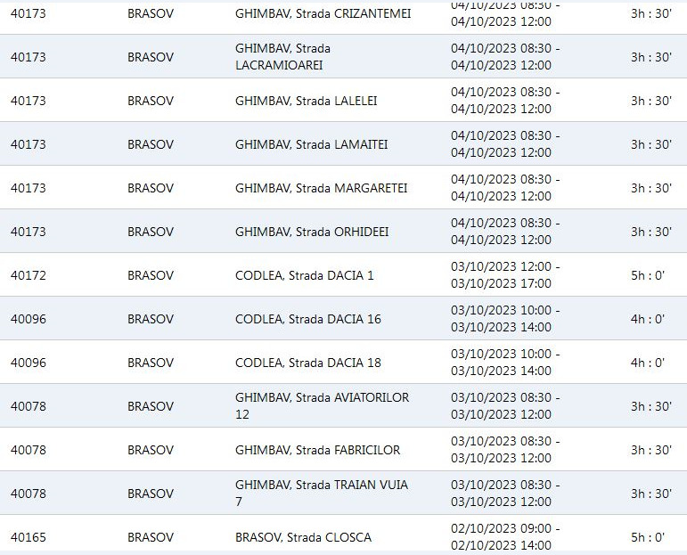 Lista străzilor și programul săptămânii viitoare sunt mai jos, cu mențiunea că datele sunt înscrise în ordine invers cronologică: