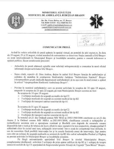 Serviciul de Ambulanță Județean (SAJ) Brașov a emis un comunicat de presă, semnat de managerul general interimar, David Zsigmond Levente, în urma articolelor apărute în MyTex în 19 august, 21 august și 22 august – Vezi AICI, AICI și AICI. Acestea vizează „numărul de autosanitare ce deservesc stația centrală a SAJ Brașov cu zona intervențională Municipiul Brașov și localitățile arondate”.