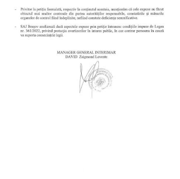 SAJ Brașov analizează dacă aspectele expuse prin petiție întrunesc condițiile impuse de Legea nr. 361/2022 privind protecția avertizorilor în interes public, în caz contrar persoana în cauză va suporta consecințele legii”.