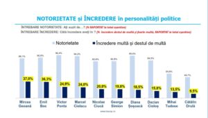 De altfel, Mircea Geoană conduce în clasamentul încrederii, 37% dintre participanții la sondaj declarând că au încredere destul de multă și foarte multă în Secretarul General Adjunct al NATO. Spun că au auzit de Mircea Geoană 89.1% dintre respondenți. În clasamentul încrederii urmează Emil Boc cu 36.3% încredere destul de multă și foarte multă (notorietate 90.9%), respectiv Victor Ponta cu 24.9% încredere destul de multă și foarte multă (notorietate 96.4%). Clasamentul este continuat de Marcel Ciolacu cu un capital de încredere de 24% (notorietate 94.2%), Nicolae Ciucă cu 20% (notorietate 82.6%), George Simion cu 19.8% (notorietate 82.8) și Diana Șoșoacă cu 18.5% (notorietate 95%). În Dacian Cioloș au încredere destul de multă și foarte multă 15.8% dintre participanții la sondaj (notorietate 84.5%), în Mihai Tudose au încredere 13.5% (notorietate 54.8%), iar în Cătălin Drulă 9.5% (notorietate 46.7%).