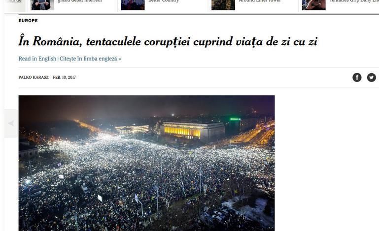 Prestigiosul cotidian „The New York Times” a publicat, astăzi, în pagina sa electronică, un articol în limba română. Articolul, intitulat „În România, tentaculele corupţiei cuprind viaţa de zi cu zi”, prezintă poveştile unor români referitoare la experienţele lor legate de corupţie.