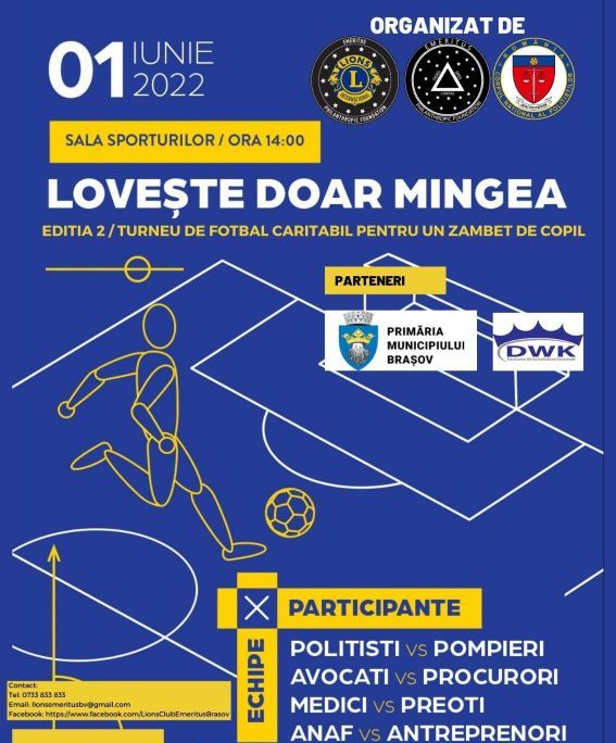Ediţia a doua a turneului caritabil „Loveşte doar mingea” va avea loc pe 1 iunie la Sala Sporturilor. Turneul este organizat de Lions Club Emeritus Brasov şi de Corpul National al Politistilor, în parteneriat cu Primăria Braşov şi Camera de Comerţ şi Industrie Braşov.