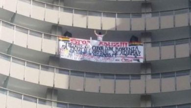 Parcă luând modelul bărbatului care protestează în aceste momente de la un balcon situat la etajul 16 al Hotelului Intercontinental...