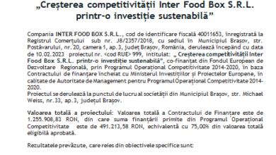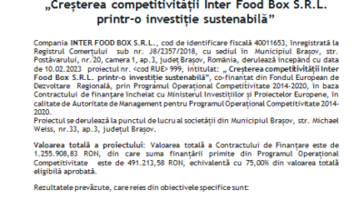 Anunț privind începerea implementării proiectului „Creșterea competitivității Inter Food Box S.R.L. printr-o investiție sustenabilă”