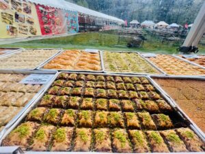 -Baklavale cu sirop din lapte unic în România cu fistic, nucă, migdale, caimac, ciocolată, vișine și multe multe altele, peste 50 de sortimente de Turkish Delight, Market turcesc, Gozleme, Su Baklava, Kunefe, Katmer.